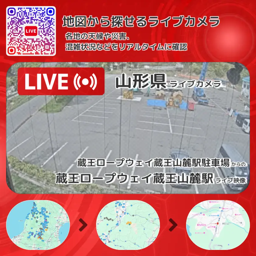 蔵王ロープウェイ蔵王山麓駅の他に、蔵王温泉スキー場 横倉ゲレンデや周辺の気象状況も併せてチェックすることが可能で、台風・大雨・地震などの災害による被害状況も把握することができます。