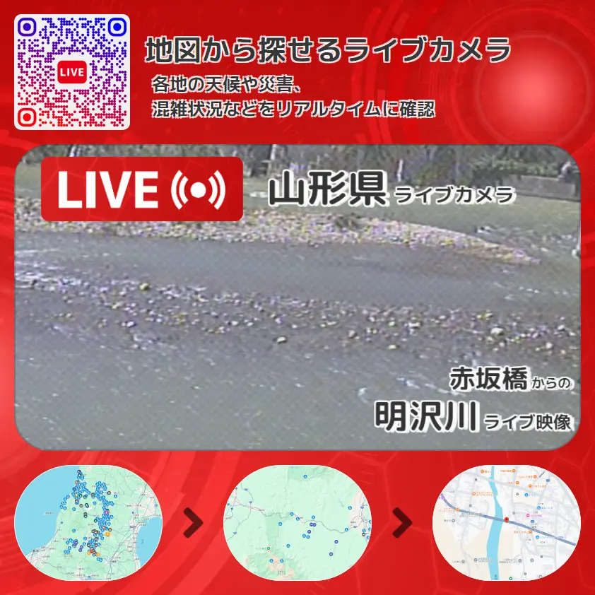 明沢川の他に、赤坂橋や周辺の気象状況も併せてチェックすることが可能で、台風・大雨・地震などの災害による被害状況も把握することができます。