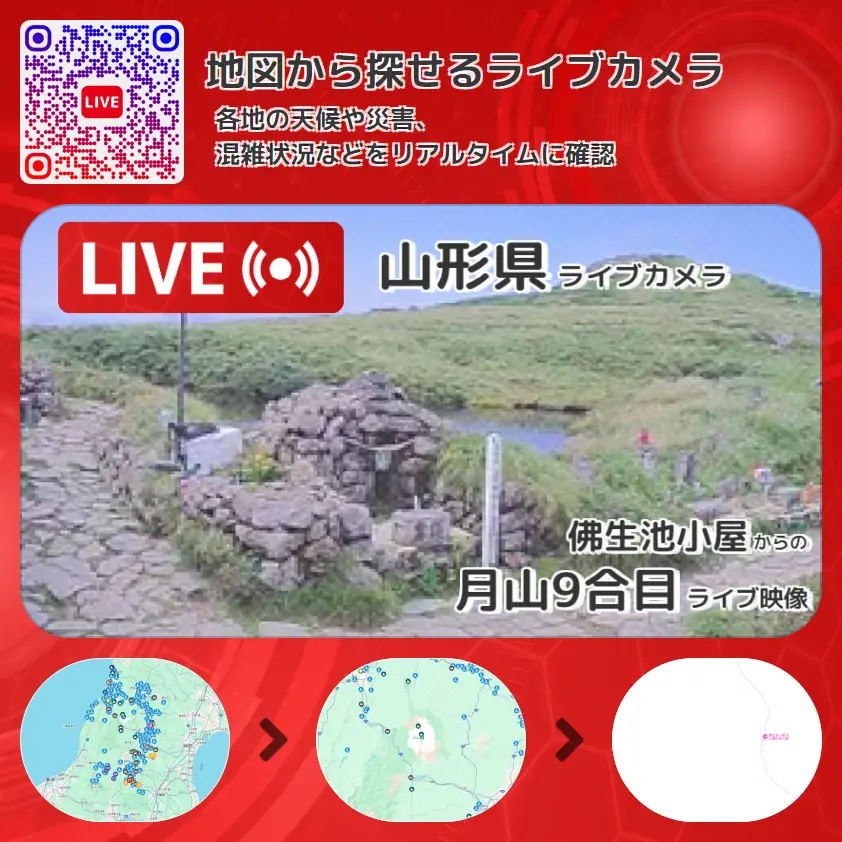 月山9合目の他に、登山者や周辺の気象状況も併せてチェックすることが可能で、台風・大雨・地震などの災害による被害状況も把握することができます。