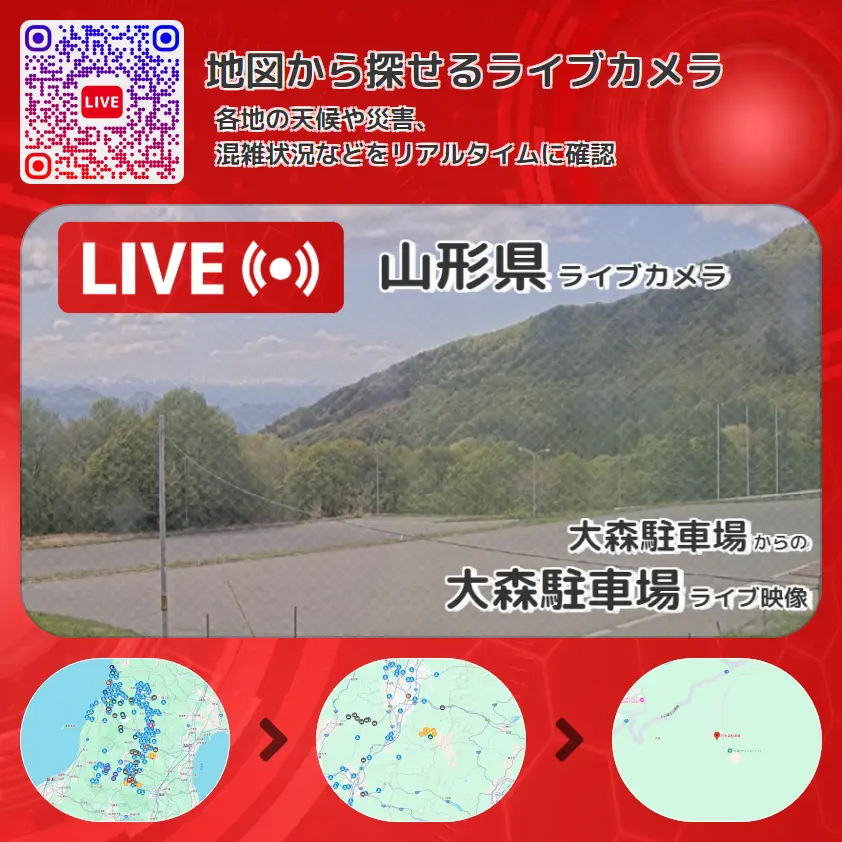 大森駐車場の他に、大森クワトロリフト付近や周辺の気象状況も併せてチェックすることが可能で、台風・大雨・地震などの災害による被害状況も把握することができます。