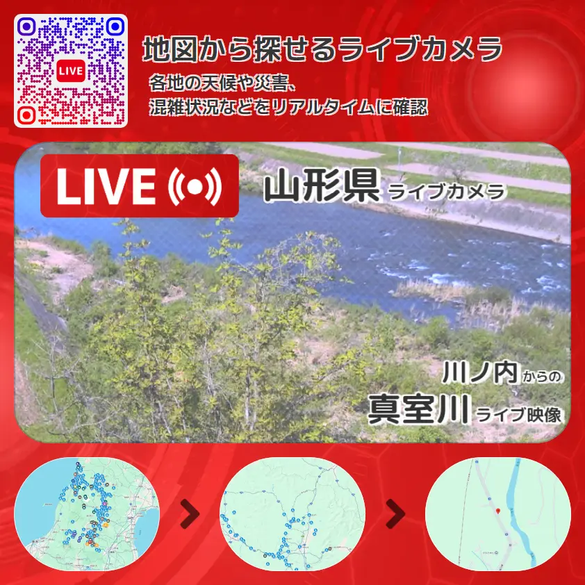 周辺の気象状況も併せてチェックすることが可能で、台風・大雨・地震などの災害による被害状況も把握することができます。