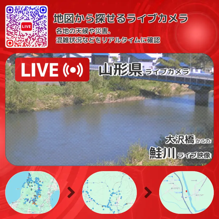 鮭川の他に、大沢橋や周辺の気象状況も併せてチェックすることが可能で、台風・大雨・地震などの災害による被害状況も把握することができます。