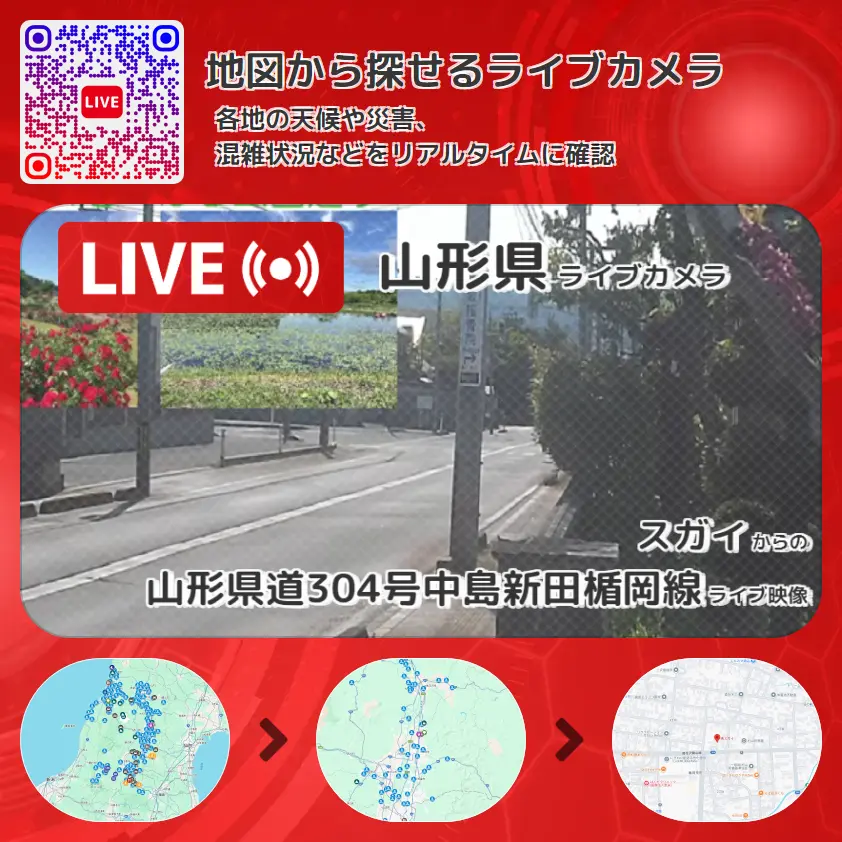 山形県道304号中島新田楯岡線(ばら公園通り)の他に、山形県道29号尾花沢関山線や周辺の気象状況も併せてチェックすることが可能で、台風・大雨・地震などの災害による被害状況も把握することができます。