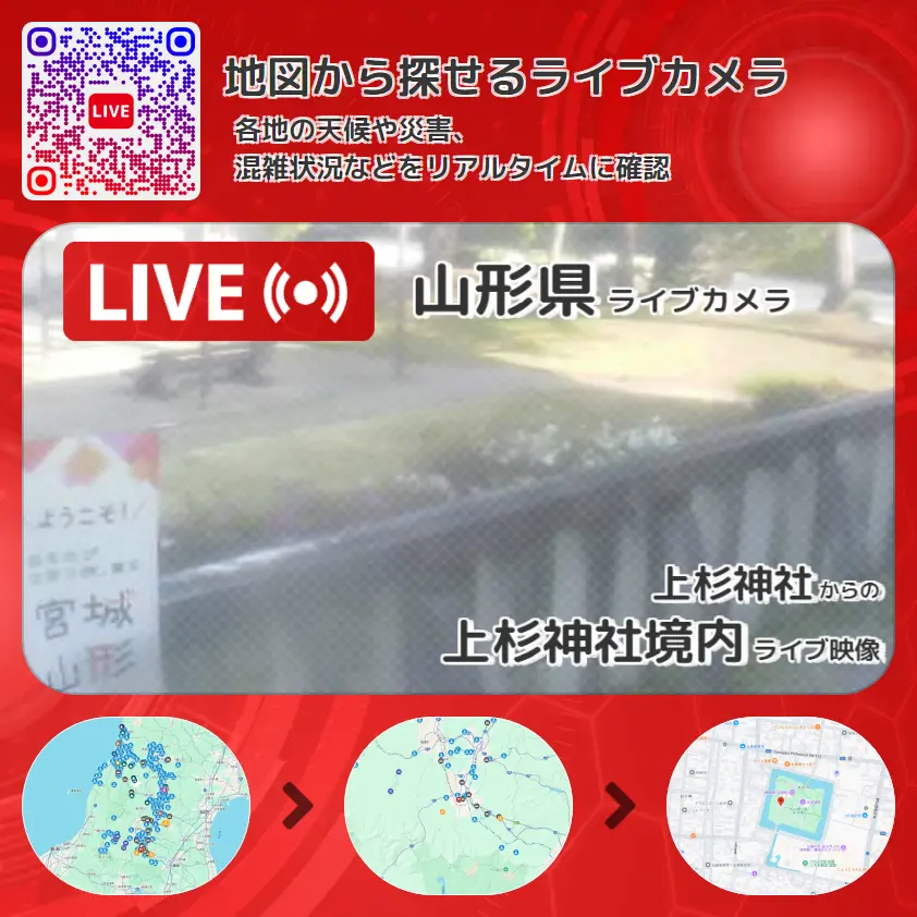 上杉神社境内の他に、案内所や周辺の気象状況も併せてチェックすることが可能で、台風・大雨・地震などの災害による被害状況も把握することができます。