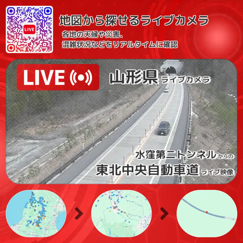 東北中央自動車道(東北中央道・東中道)の他に、水窪第二トンネルや周辺の気象状況も併せてチェックすることが可能で、台風・大雨・地震などの災害による被害状況も把握することができます。