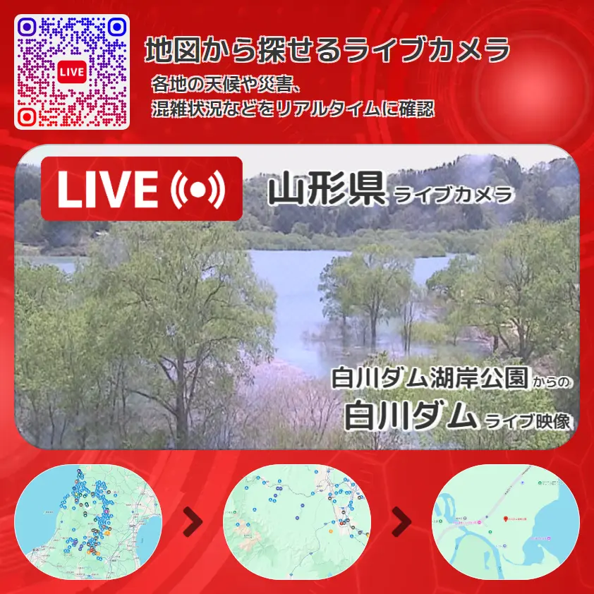 白川ダムの他に、白川ダム湖岸公園や周辺の気象状況も併せてチェックすることが可能で、台風・大雨・地震などの災害による被害状況も把握することができます。