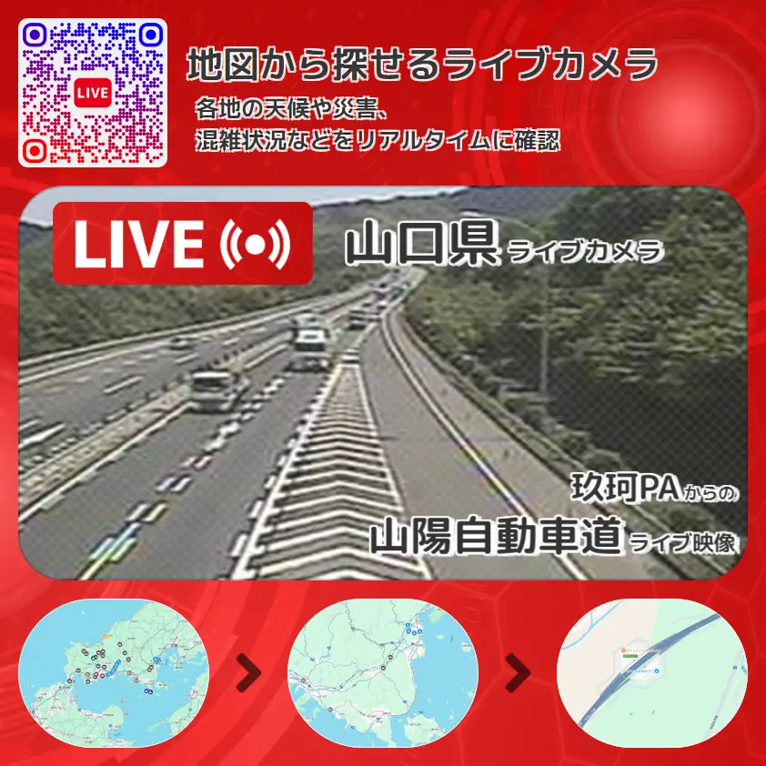 山陽自動車道(山陽道)の他に、玖珂パーキングエリア下りや周辺の気象状況も併せてチェックすることが可能で、台風・大雨・地震などの災害による被害状況も把握することができます。