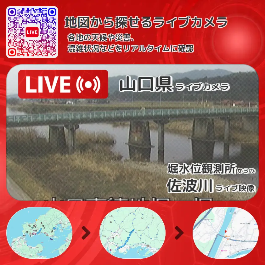 佐波川の他に、出雲合橋や周辺の気象状況も併せてチェックすることが可能で、台風・大雨・地震などの災害による被害状況も把握することができます。
