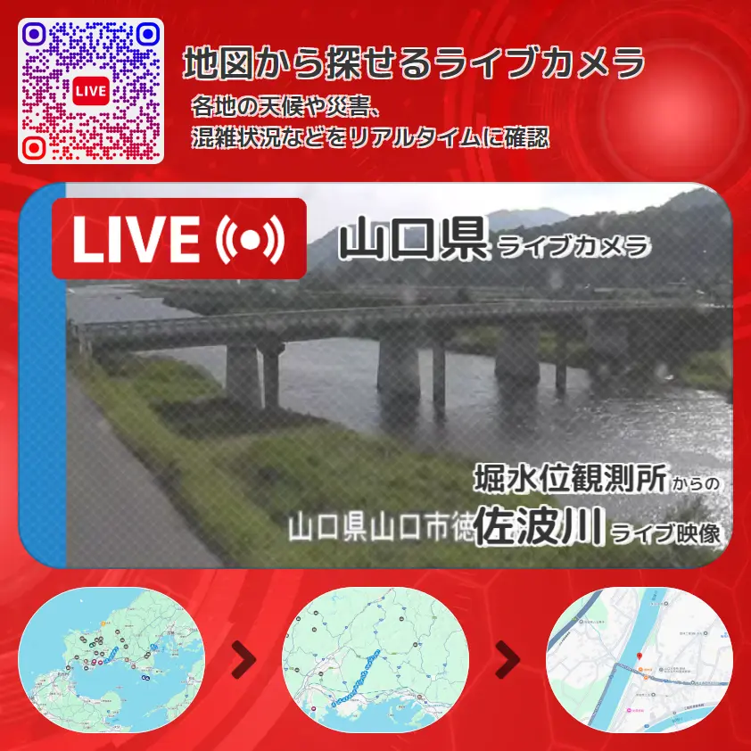 佐波川(佐波川水系)の他に、出雲合橋や周辺の気象状況も併せてチェックすることが可能で、台風・大雨・地震などの災害による被害状況も把握することができます。