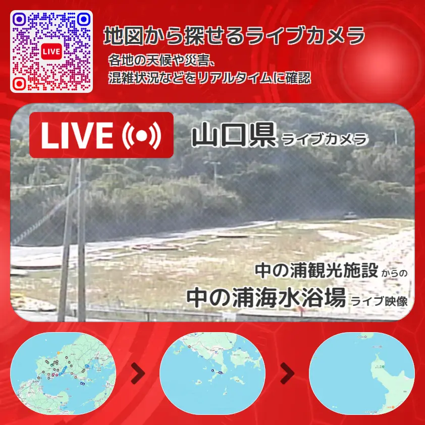 中の浦海水浴場の他に、皇座山や周辺の気象状況も併せてチェックすることが可能で、台風・大雨・地震などの災害による被害状況も把握することができます。