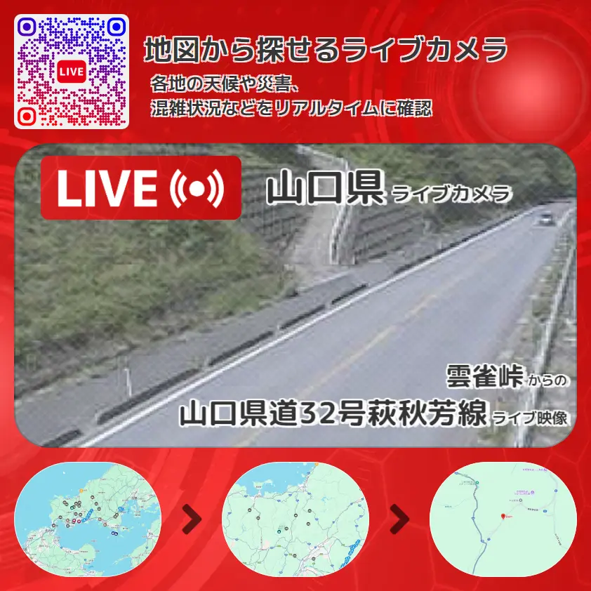 山口県道32号萩秋芳線の他に、雲雀峠や周辺の気象状況も併せてチェックすることが可能で、台風・大雨・地震などの災害による被害状況も把握することができます。