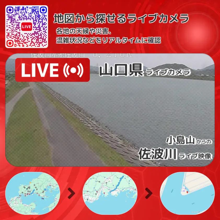 佐波川の他に、横曽根川合流付近付近や周辺の気象状況も併せてチェックすることが可能で、台風・大雨・地震などの災害による被害状況も把握することができます。