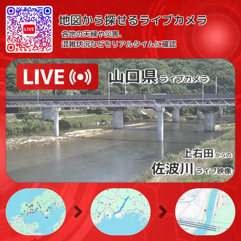 周辺の気象状況も併せてチェックすることが可能で、台風・大雨・地震などの災害による被害状況も把握することができます。