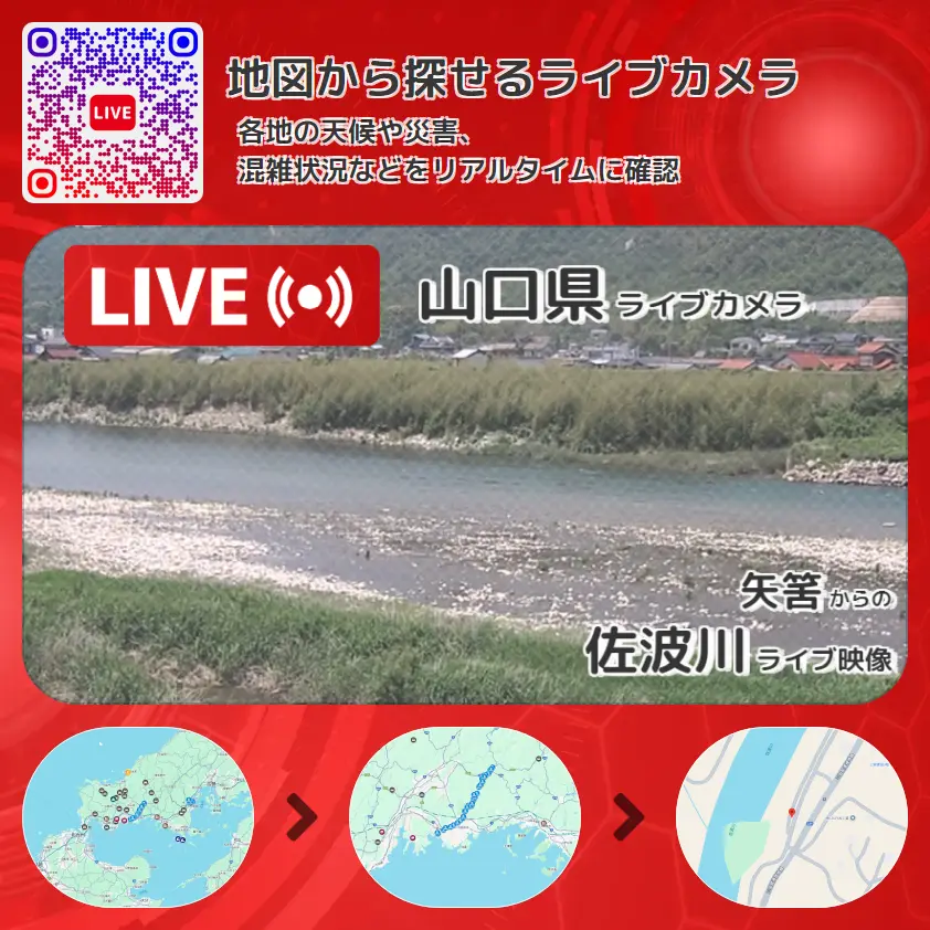 周辺の気象状況も併せてチェックすることが可能で、台風・大雨・地震などの災害による被害状況も把握することができます。