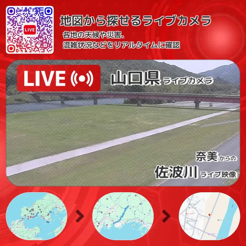 佐波川の他に、中央橋や周辺の気象状況も併せてチェックすることが可能で、台風・大雨・地震などの災害による被害状況も把握することができます。