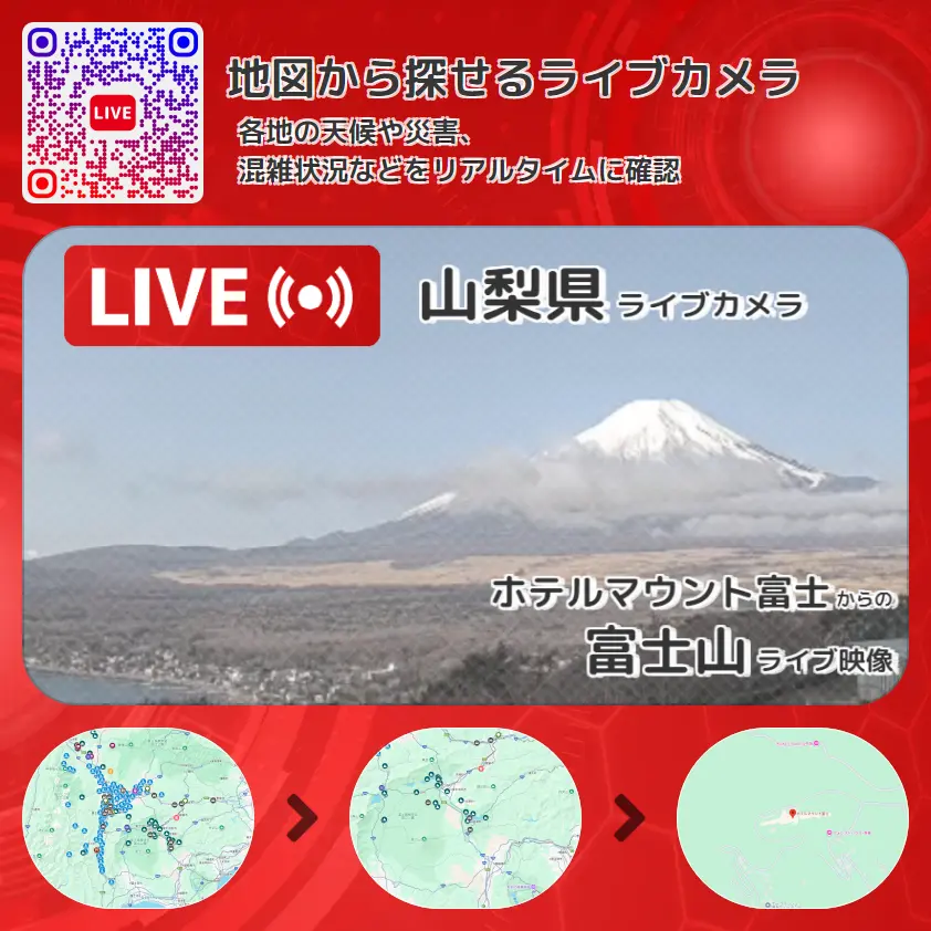富士山の他に、山中湖や周辺の気象状況も併せてチェックすることが可能で、台風・大雨・地震などの災害による被害状況も把握することができます。