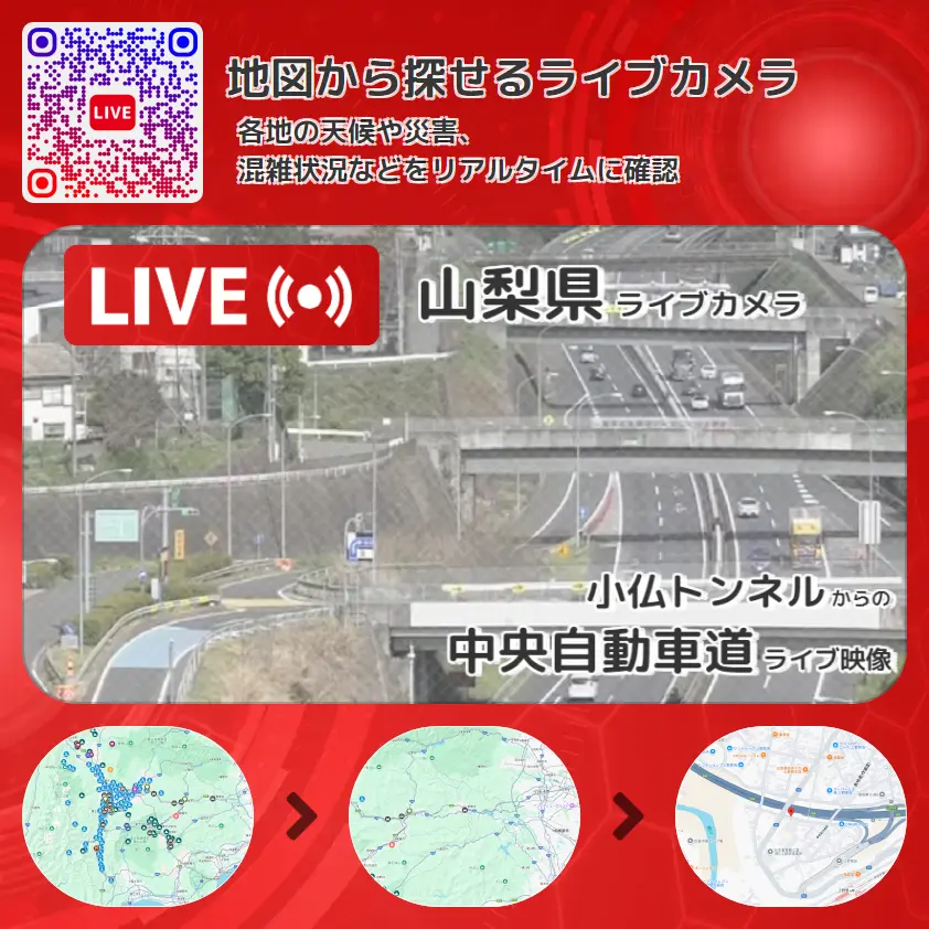 中央自動車道(中央道・中央高速)の他に、上野原インターチェンジ(上野原IC)や周辺の気象状況も併せてチェックすることが可能で、台風・大雨・地震などの災害による被害状況も把握することができます。