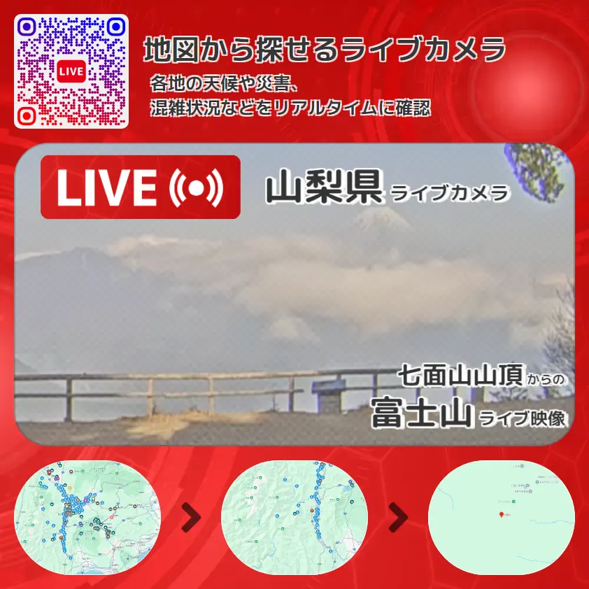 富士山の他に、御来光や周辺の気象状況も併せてチェックすることが可能で、台風・大雨・地震などの災害による被害状況も把握することができます。
