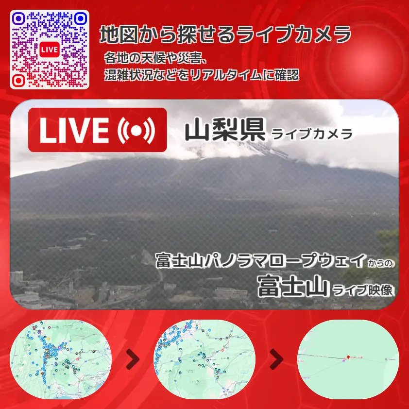 富士山の他に、富士山樹海(富士樹海)や周辺の気象状況も併せてチェックすることが可能で、台風・大雨・地震などの災害による被害状況も把握することができます。