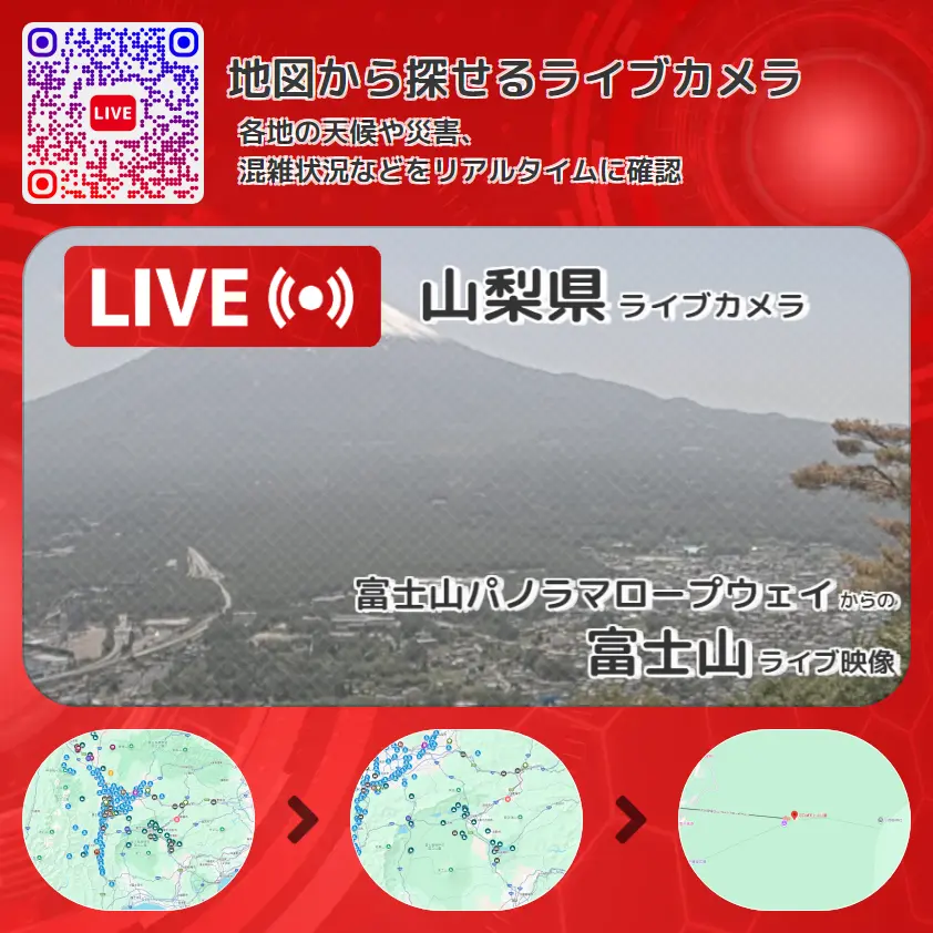 富士山の他に、富士山樹海(富士樹海)や周辺の気象状況も併せてチェックすることが可能で、台風・大雨・地震などの災害による被害状況も把握することができます。