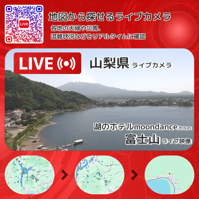 富士山の他に、河口湖や周辺の気象状況も併せてチェックすることが可能で、台風・大雨・地震などの災害による被害状況も把握することができます。