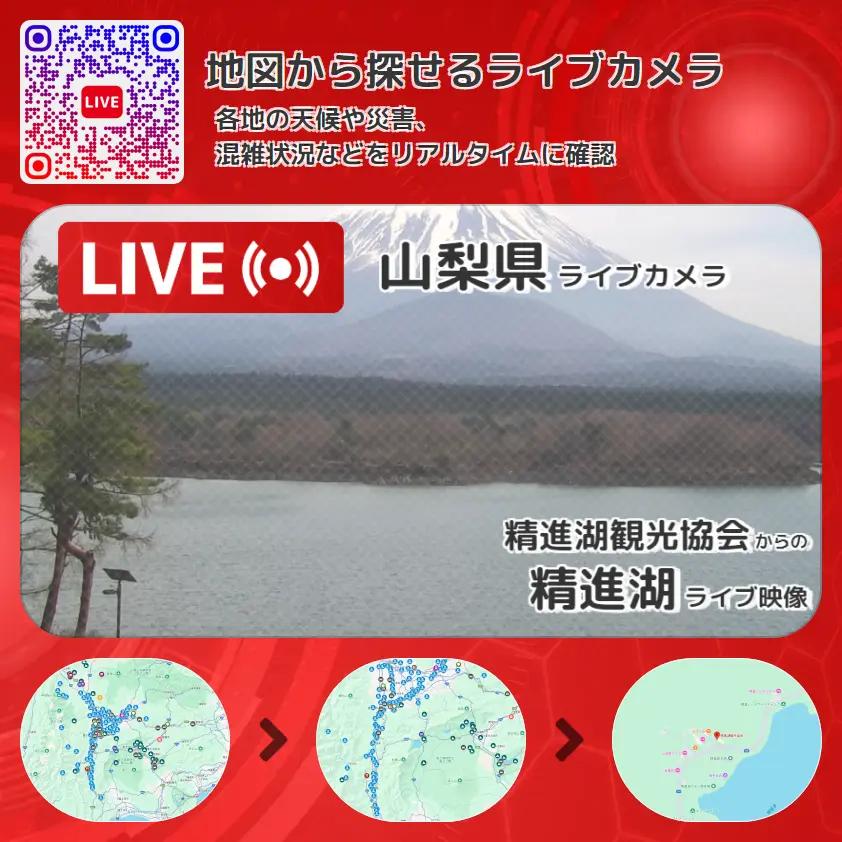 精進湖の他に、富士山や周辺の気象状況も併せてチェックすることが可能で、台風・大雨・地震などの災害による被害状況も把握することができます。