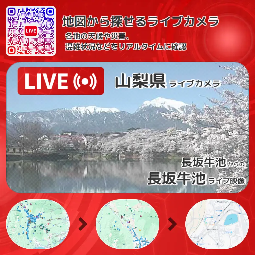 長坂牛池(長坂湖)の他に、桜(ソメイヨシノ)や周辺の気象状況も併せてチェックすることが可能で、台風・大雨・地震などの災害による被害状況も把握することができます。